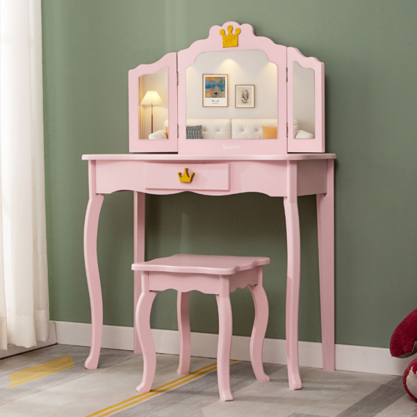 - Märchenhaftes Design: Rosa Farbe, geschwungene Beine und goldene Kronendetails am Spiegel und an der Schublade verleihen dem Tisch eine royale Ausstrahlung.