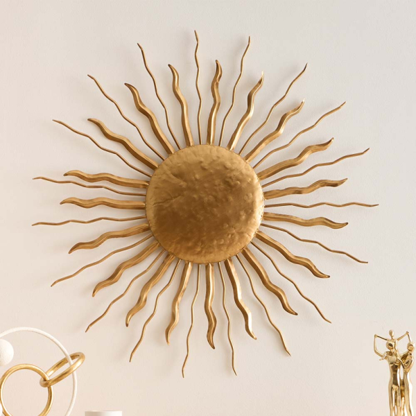 - Auffälliges Sonnendesign: Strahlende goldene Sonnenstrahlen sorgen für einen verspielten und eleganten Akzent an Ihrer Wand.