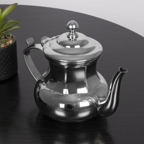 Mit der Hexagon-Teekanne von Bama können Sie echten marokkanischen Tee, frischen Minztee oder einfach Ihren Lieblingstee auf klassische Weise zubereiten. Die silberne Gießkanne hat ein einzigartiges Design mit einer runden Form. Dank des langen Ausgusses gießen Sie den heißen Tee gleichmäßig aus. Die Hexagon-Teekanne ist aus robustem 18/10-Edelstahl mit hochglänzender Oberfläche gefertigt. Die Teekanne lässt sich leicht mit einer Hand bedienen. Sie können zum Beispiel den Klappdeckel einfach mit dem Daumen öffnen. Diese Edelstahl-Teekanne hat ein Fassungsvermögen von 0,7 Litern, der Boden hat einen Durchmesser von 7,5 cm.