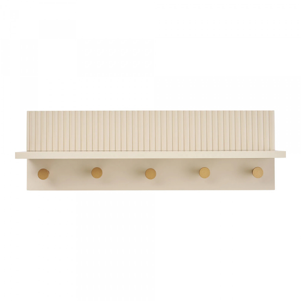 - Design: Beige Wandregal mit einem subtil geriffelten Paneel und fünf runden Haken, die sowohl dekorativ als auch praktisch sind.