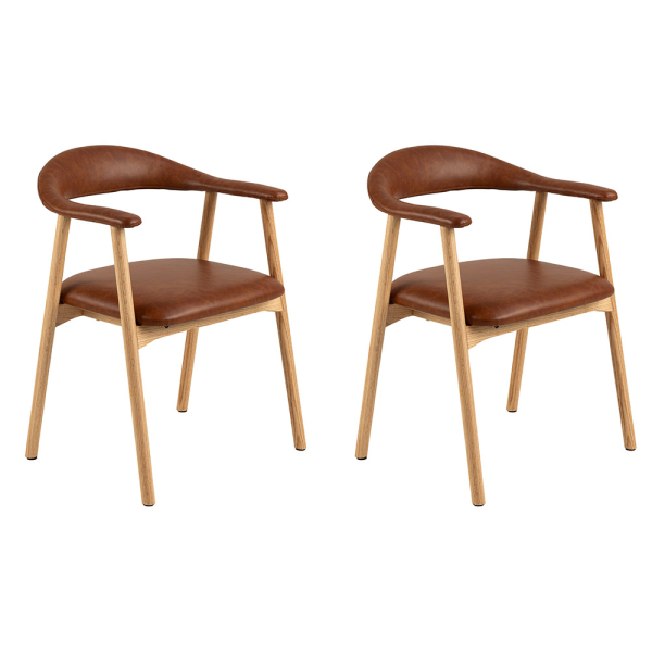 Der Esszimmerstuhl Luna der Marke Smuk zeichnet sich durch seine offene Rückenlehne und die Armlehnen aus. Der Smuk Esszimmerstuhl hat ein schönes Design mit einer Farbkombination aus Holz und Cognac. Das Holzgestell ist aus geölter Eiche und die Polsterung ist aus PU-Kunstleder gefertigt. Die warme Farbe des Eichengestells schafft eine warme, einladende Atmosphäre, während die Cognacfarbe ein robustes Element hinzufügt. Der Cognac-Esszimmerstuhl wird als Set mit 2 Stühlen verkauft und hat eine Breite von 56 cm, eine Tiefe von 54 cm und eine Höhe von 75,5 cm.