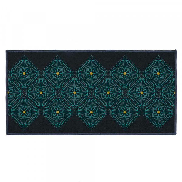 Der Teppichläufer Talon Blue verleiht Ihrer Küche oder Ihrem Flur einen stilvollen Touch. Der schwarz mit blaue Teppichläufer hat eine Oberseite aus Polyamid und eine Unterseite aus Latex. Der Küchenläufer ist mit einem symmetrischen Druck verziert und hat eine Farbkombination aus Schwarz und Blau. Der Teppichläufer Talon Blue ist 50 cm mal 120 cm groß und kann bei 30°C in der Maschine gewaschen werden.