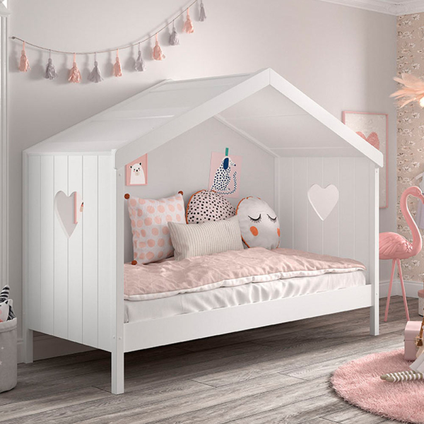 Le lit maisonnette 90x200 cm Bloom de Dream Tree est un magnifique lit d'enfant pour les petites princesses. Le lit d'enfant a un toit et 2 cœurs dans la tête et le pied de lit. Le lit d'enfant Bloom est fabriqué en MDF et pin laqué et est livré avec un sommier à lattes. Le lit simple apporte une touche romantique à la chambre d'enfant grâce à sa finition décorative et à ses cœurs. Le lit cabane Dream Tree convient aux enfants à partir de 4 ans, avec un poids maximal de 75 kg.