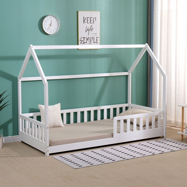 Le lit maisonette 90x200 cm Melissia de Milton & Oldbrook apporte une touche ludique et amusante à la chambre d'enfant. En effet, le lit maison Melissia présente un design amusant avec une barre de sécurité et un toit ouvert où vous pouvez accrocher des guirlandes ou des lumières. Le lit pour enfants est fabriqué en pin et est livré avec un sommier à lattes. Le lit d'enfant Milton & Oldbrook est un lit de sol montesorri, qui aide à développer l'indépendance de l'enfant. Il permet à votre enfant de sortir et d'entrer dans le lit tout seul, et de lire ou de jouer quand il le souhaite. Le lit en Blanc montesorri Melissia convient aux enfants à partir de 3 ans.