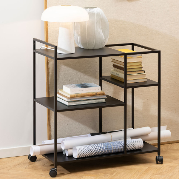 Le chariot noir Davian de Smuk est une table roulante élégante qui s'intègre parfaitement dans un intérieur moderne ou industriel. Vous pouvez utiliser le Davian dans différentes pièces. Vous pouvez l'utiliser dans la cuisine pour vos épices, livres de cuisine, vaisselle et autres. Vous pouvez également l'utiliser dans le salon pour ranger des livres, des papiers et des ustensiles d'écriture. Le chariot multifonctionnel est fabriqué en métal laqué et comporte 4 niveaux. Le chariot repose sur 4 roues, ce qui vous permet de faire rouler le Davian partout. Le chariot Smuk a une longueur de 78 cm, une largeur de 40 cm et une hauteur de 85 cm.