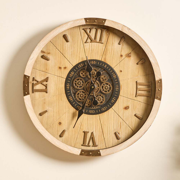 - Mécanisme : Le mécanisme d’engrenages visible au centre confère à l’horloge un style industriel robuste avec un caractère vintage authentique.