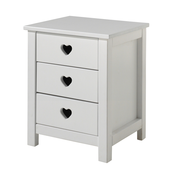 La table de chevet blanche de la collection Bloom de Dream Tree s'adapte parfaitement à côté du lit de votre enfant. La table de chevet blanche pour enfants comporte 3 tiroirs avec suffisamment d'espace pour les jouets ou les livres. Il est fabriqué en bois de pin massif et est laqué en blanc. Les poignées de cette commode ont la forme d'un cœur..