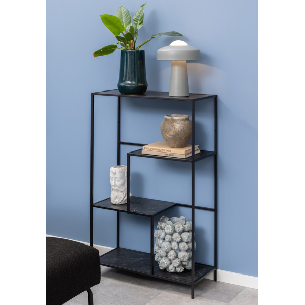 Le design industriel subtil de cette armoire à étagères Finja de Smuk confère à cette armoire à étagères noire une élégance unique. Les plateaux en mélamine à l'aspect marbre noir est facile à entretenir et le cadre métallique a reçu un revêtement en poudre noir pour plus de durabilité. L’armoire à étagères Finja comporte 3 niveaux, ce qui vous permet de décorer l’armoire avec des accessoires et des plantes. L’armoire à étagères Smuk a une largeur de 72 cm, une profondeur de 32 cm et une hauteur de 114 cm.