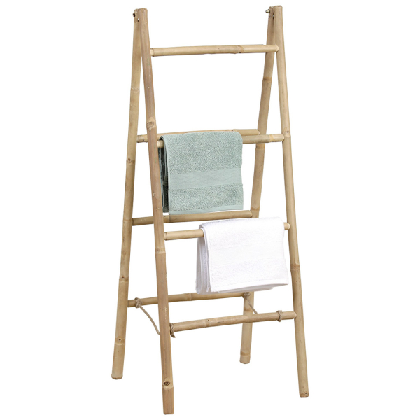L'échelle à serviettes Tim de Lamento est un meuble de rangement pratique pour la salle de bains. Le porte-serviettes Tim est fabriqué en bambou, une essence de bois qui crée une atmosphère chaleureuse et naturelle dans la salle de bains. Le porte-serviettes comporte un total de 8 bras de suspension, ce qui vous donne suffisamment d'espace pour suspendre plusieurs serviettes. En plus du porte-serviettes, vous pouvez également utiliser l'échelle Tim comme porte-vêtements. L'échelle à serviettes Lamento a une largeur de 48 cm, une profondeur de 52,5 cm et une hauteur de 116 cm.