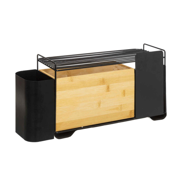 L'organisateur de cuisine Varian d'Eazy Living est indispensable à toute cuisine. L'organisateur multifonctionnel en bambou et en métal veille à ce que tout ait sa place dans votre cuisine. L'organiseur comporte un compartiment de rangement en bois, un compartiment de stockage, un bloc de couteaux, une étagère pour les ustensiles de cuisine, un emplacement pour une planche à découper et un emplacement pour des notes à écrire. L'organisateur Eazy Living a une longueur de 44 cm, une largeur de 14 cm et une hauteur de 22,2 cm.