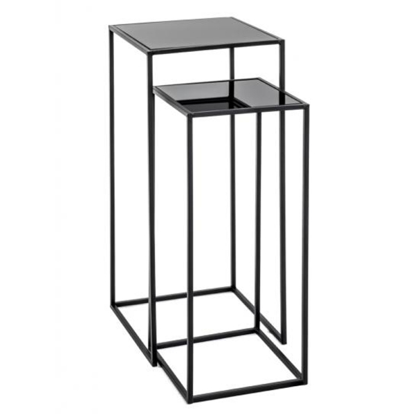 Sur les tables à plantes Monik de Vesta, vos plus belles plantes sont entièrement sous les feux de la rampe. Cet ensemble de tables d'appoint hautes est fabriqué en métal avec des plateaux incrustés en verre de sécurité trempé noir résistant. Les 2 tables noires s'emboîtent grâce à la base semi-ouverte de la table la plus haute.
