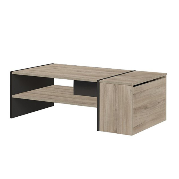 Avec la table basse Valeria de Favo Casa, vous disposez d'un grand espace de rangement dans le salon. En effet, la table Valeria dispose d'un coffre de rangement sur le côté et d'un espace de rangement ouvert sous le plateau de la table. Vous pouvez utiliser le coffre et l'espace de rangement pour ranger un plaid, des sous-verres, des magazines et bien plus encore. La table basse rectangulaire est fabriquée en aggloméré recouvert de papier noir uni et d'imitation chêne. La table basse de Favo Casa a une largeur de 107 cm, une profondeur de 60 cm et une hauteur de 38 cm.
