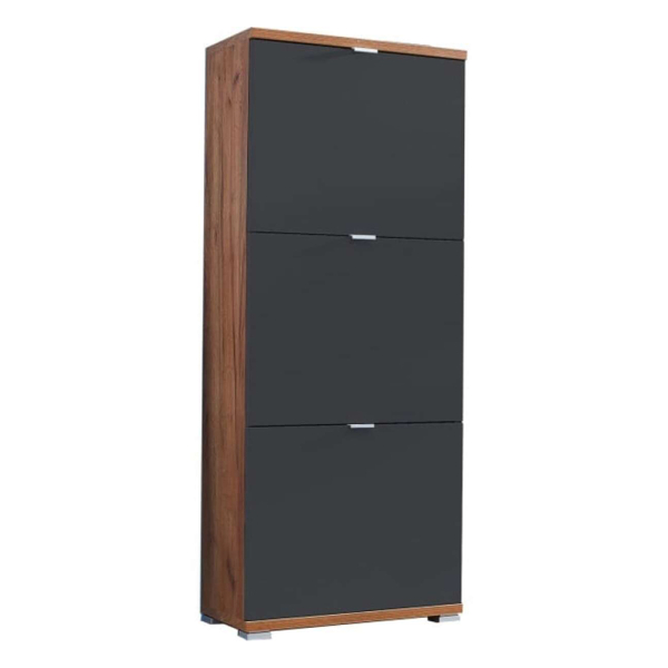 Ce magnifique meuble à chaussures Joshua à 3 compartiments de Vendomo est le rangement idéal pour les chaussures. Cette armoire de rangement est fabriquée en plaque-panneau robuste. La combinaison de l'armoire en bois avec les panneaux noirs donne à l'armoire un aspect chaleureux que vous pouvez parfaitement mettre dans n'importe quel intérieur. Vous pouvez ranger jusqu'à 12 paires de chaussures dans ce meuble à chaussures pratique. Le rangement comporte 3 panneaux noirs intemporels en MDF avec des poignées métalliques. Cette armoire est disponible en plusieurs combinaisons de couleurs.