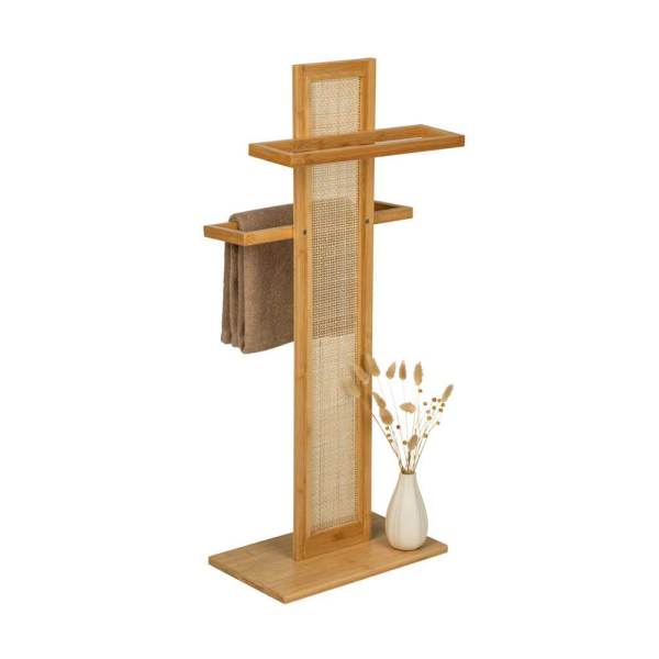 Optez pour une touche naturelle dans la salle de bains avec le porte-serviettes Allegre de Wenko. Ce porte-serviettes est fabriqué en bambou et décoré d'un magnifique tissage en rotin. Le porte-serviettes sur pied est doté de deux bras suspendus que vous pouvez régler en hauteur. Le porte-serviettes a un design élégant et bohème que vous pouvez placer dans différentes salles de bains. Vous pouvez utiliser le porte-serviettes comme porte-serviettes de salle de bains, mais vous pouvez également l'utiliser comme petit porte-vêtements ou comme porte-serviettes de cuisine. Le porte-serviettes de Wenko a une largeur de 37 cm, une profondeur de 22 cm et une hauteur de 88 cm.