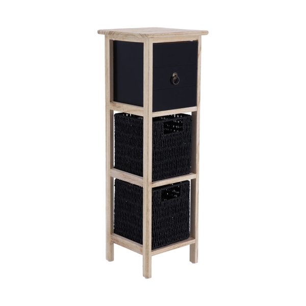 L'armoire à paniers étroite Robbe de Lamento est un meuble de rangement amusant pour la maison. L'armoire à paniers est fabriquée en MDF et en bois de paulownia et présente une combinaison de couleurs bois et noir. L'armoire à paniers comporte 1 tiroir et 2 paniers. Le tiroir est muni d'un anneau en guise de poignée, et les paniers sont munis d'une ouverture en guise de poignée. L’armoire de rangement Robbe peut être utilisé dans différentes pièces et apporte plus d'ordre à votre intérieur. L'armoire paniers Lamento a une largeur de 25 cm, une profondeur de 25 cm et une hauteur de 77 cm.