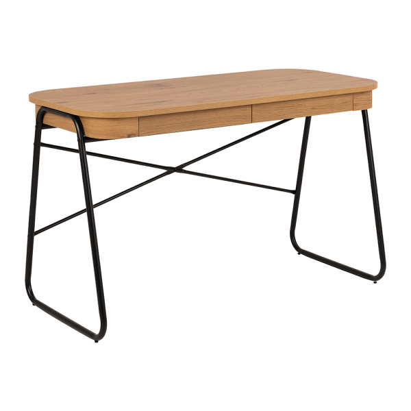 Vous souhaitez créer un coin informatique ou un coin créatif dans votre maison ? Le bureau Lio de Smuk est la solution idéale. L'aspect chêne sauvage, les coins arrondis et le cadre en tube d'acier noir se combinent pour créer un design élégant. Les 2 tiroirs permettent de ranger stylos, cahiers et autres petits objets indispensables. Vous pouvez facilement combiner le bureau Smuk avec une large gamme de chaises de bureau grâce à son design simple et élégant. Le bureau a une largeur de 120 cm, une profondeur de 60 cm et une hauteur de 75 cm.