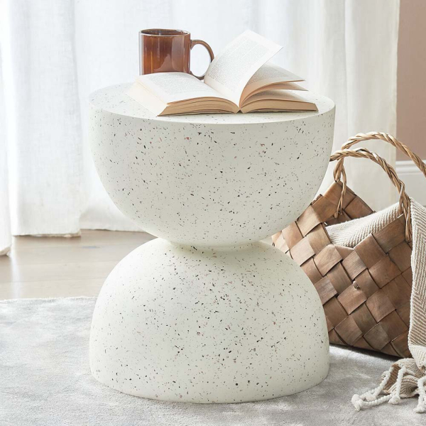 - Finition terrazzo : La texture subtilement mouchetée donne à la table une allure luxueuse qui s’intègre aux intérieurs modernes comme scandinaves.