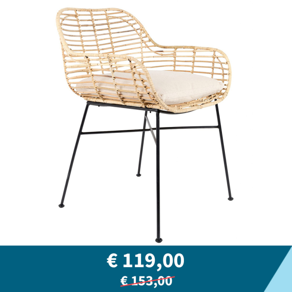 Optez pour un look authentique et exotique dans votre salle à manger avec la chaise de salle à manger Amber de Nesthaus. La chaise de salle à manger est fabriquée en rotin et repose sur des pieds en métal noir. La chaise en rotin est de couleur naturelle et ajoute une touche de confort à votre intérieur. La chaise Nesthaus est livrée avec un coussin d'assise.