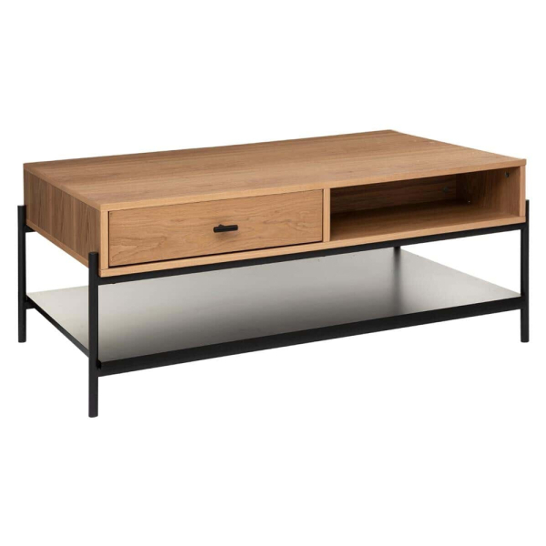 La table basse Vivey d'Eazy Living allie design moderne et praticité. La table basse est dotée d'un grand plateau en bois, d'un compartiment ouvert et d'un tiroir permettant de ranger de petits objets pour garder le salon organisé. L'étagère inférieure offre encore plus d'espace pour les livres, les magazines et autres objets. La table basse Vivey de style néo-scandinave possède une base originale en métal noir et un plateau en placage de frêne qui apporte une touche chaleureuse et contemporaine. La table basse Vivey est donc idéale à combiner avec des couleurs douces et des tons pastel.