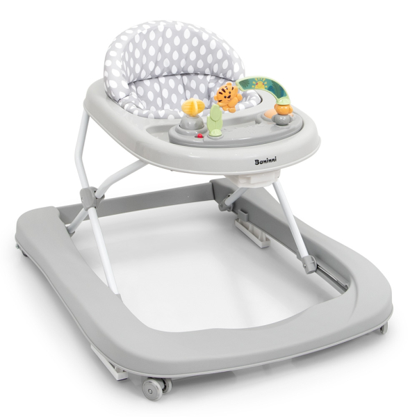 Laat je kindje ontdekken met de Miro loopstoel van het merk Baninni. Met de grijze loopstoel kan je kindje zijn eerste stapjes oefenen en leuk spelen. De Miro is uitgerust met een interactief speelblad met verschillende speeltjes. De verschillende speeltjes dragen bij aan de motorische en sensorische ontwikkeling. De baby walker kan je in de hoogte verstellen, en na gebruik makkelijk opvouwen en opbergen. De Baninni loopstoel is uitgerust met zachte rubberen parketwieltjes en remblokken. De bekleding met witte stippen is afneembaar en kan je makkelijk reinigen. De Miro loopstoel is gemaakt voor kinderen vanaf 6 maanden, tot maximaal 12 kg.