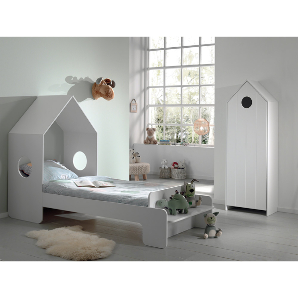 De Haven kinderkamer van Dream Tree is de kamer voor elke strandliefhebber! De Haven kinderkamer set bestaat uit een huisbed en een kledingkast met als thema ‘strandhuisje’. Het kinderbed heeft een leuk dakje en zitbankje, en de kledingkast lijkt net op een strandcabine. De witte kast heeft een deur met verticale lijnen. Je kan de opbergkast zelf indelen, je hebt keuze uit 3 of 4 planken, en/of een kledingroede. Zo kan je er een kledingkast, boekenkast op opbergkast van maken. Het bed is gemaakt voor kinderen vanaf 4 jaar en deze wordt geleverd inclusief lattenbodem. Alle meubels worden geleverd als bouwpakket.