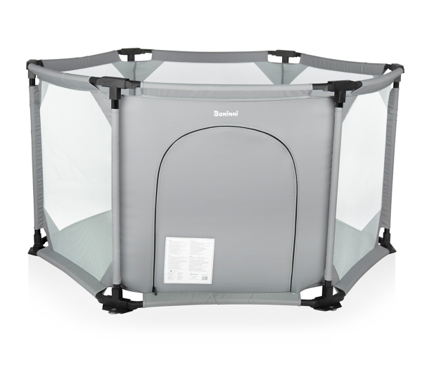 Je kindje kan in alle veiligheid en comfort spelen de Giocco box van Baninni. Dit zeshoekige parkje heeft een stevig aluminium frame en is makkelijk op te stellen in de woonkamer of babykamer. Het Giocco parkje is voorzien van een luikje met rits voor een makkelijke toegang. Dankzij het gaas aan de zijkanten kan je langs alle kanten je kindje in de gaten houden. Onderaan de Giocco speelbox bevinden zich zuignappen voor extra stabiliteit. De polyester bekleding kan gewassen worden op 30°. De Giocco box is enkel geschikt voor gebruik binnenshuis.In het lichtgrijze Giocco speelpark heeft je kleintje voldoende ruimte om te spelen of te rusten. Zo heeft het babyparkje een binnenzijde van 125 cm breed. Het parkje is 72 cm hoog. De Giocco box van Baninni is geschikt voor kinderen vanaf 5 maanden tot 3 jaar oud.Op zoek naar een veilig speelparkje voor je kindje? Bekijk alle parken en boxen op onze webshop!