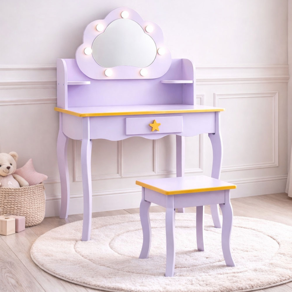 Met zijn lieve design, praktische indeling en speelse details is deze kinderkaptafel met krukje een prachtige toevoeging aan elke kinderkamer. De Cloudy make-uptafel voor kinderen stimuleert fantasierijk spel en helpt tegelijk om een gezellige, georganiseerde omgeving te creëren waar kinderen zich helemaal thuis voelen.
