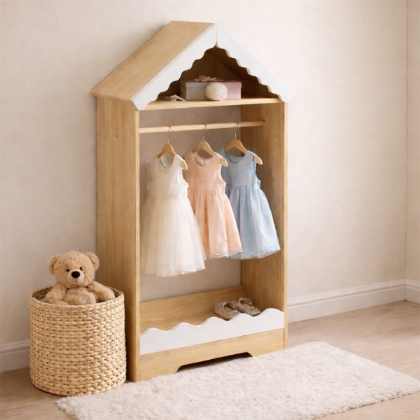 - Speels en stijlvol ontwerp: De kledingkast heeft een charmant huisvormig design met wolkvormige accenten, wat zorgt voor een vrolijke en kindvriendelijke uitstraling.