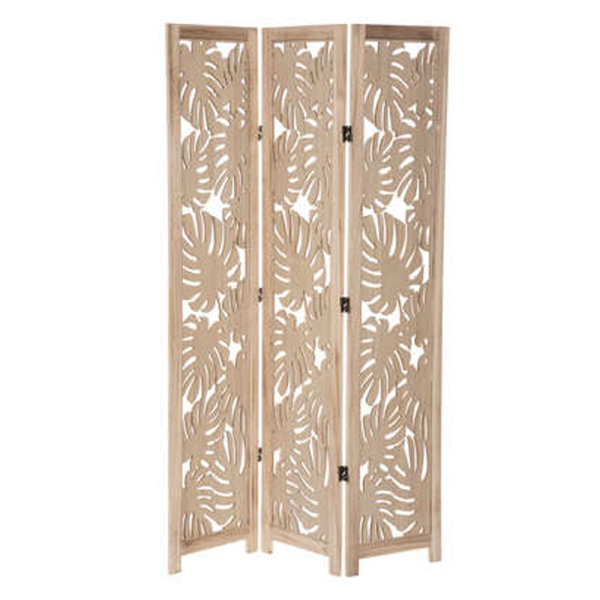 Met een decoratieve scheidingswand transformeer je jouw interieur in een sfeervolle leefruimte en kan je de kamer op een subtiele wijze indelen. Dit houten kamerscherm Magala van Eazy Living bestaat uit 3 panelen met palmbladeren dessin waardoor het een exotische toets geeft aan je inrichting. Het Magala kamerscherm is 106,5 cm breed en 165 cm hoog.