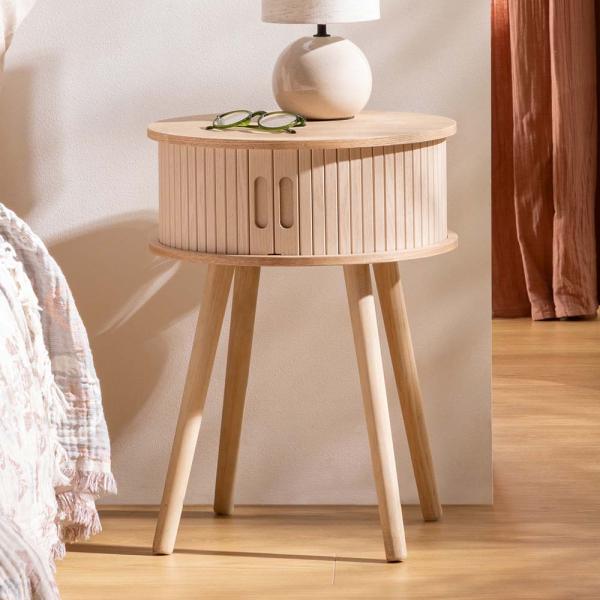 Het Agatha nachtkastje van Eazy Living zorgt voor een frisse toets in huis. Het Agatha kastje heeft een mooi ontwerp met een kleurcombinatie van beige en hout. Het ronde nachtkastje is gemaakt van MDF en is afgewerkt met houtfineer. Het Eazy Living nachtkastje heeft 2 schuifdeuren die zijn versierd met mooie latten. De deuren zijn afgewerkt met ingebouwde handvaten. Het houten nachtkastje staat op schuine poten en zorgt voor extra opbergruimte in huis. Het Agatha nachtkastje kan ook gebruikt worden als bijzettafel. Het nachtkastje heeft een diameter van 40 cm en is 54 cm hoog.
