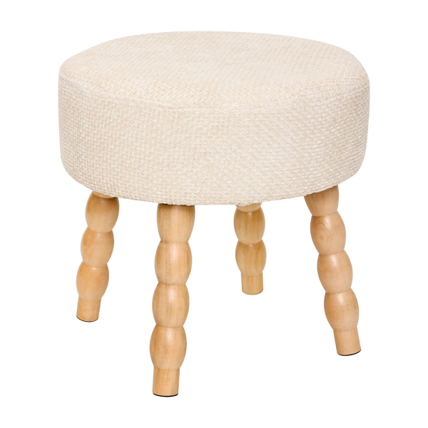 - Elegant design: Het krukje heeft een verfijnde witte chenille bekleding en bijzondere, gedraaide houten poten die een speelse en moderne uitstraling creëren.