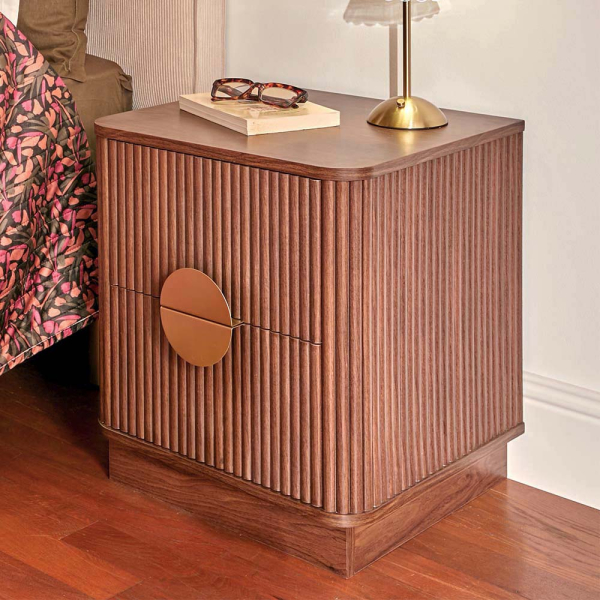 - Elegant design: De combinatie van de warme walnootlook met verticale groeven en een ronde gouden greep geeft het Adelise nachtkastje een luxe uitstraling.