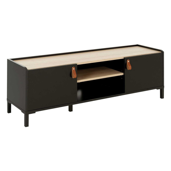 Het Lola TV-meubel van Favo Casa is een mooie toevoeging aan een strak interieur. De TV-kast heeft een stijlvolle look met een kleurcombinatie van zwart en hout, bruine lederen handgrepen en dunne pootjes. Bovendien is het TV-meubel uitgerust met 2 deuren en een open opbergvak. Zo heb je voldoende opbergruimte in de woonkamer. Het Favo Casa TV-meubel is gemaakt van spaanplaat bekleed met effen zwart papier en kastanje-imitatie. De Lola heeft een breedte van 136 cm, een diepte van 40 cm en een hoogte van 44 cm.