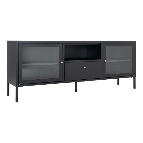 De Kari TV-meubel van House Collection is een stijlvolle opbergkast voor in de woonkamer. Het zwarte TV-meubel is gemaakt van staal en is uitgerust met 2 glazen deuren en 1 lade. Achter de deuren heb je 2 legplanken. De TV-kast is ook voorzien van een open opbergvak waarin je multimedia kan plaatsen. De TV-kast Kari heeft een stijlvol ontwerp dat je makkelijk kan combineren met allerlei meubels en decoratie. De House Collection kast heeft een breedte van 160 cm, een diepte van 35 cm en een hoogte van 60 cm.