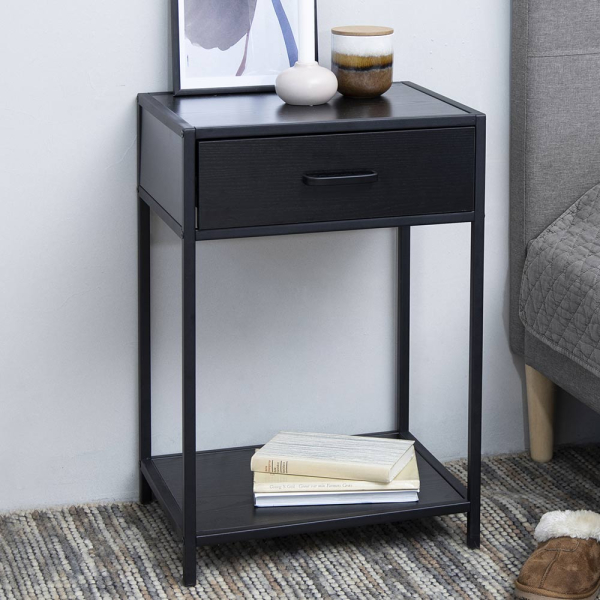 Het zwarte Chelsea nachtkastje van Smuk is een stoer nachtkastje dat zeker niet naast je bed mag ontbreken. Het nachtkastje is gemaakt van metaal en MDF, en is uitgerust met een handige lade. Het kastje heeft 2 niveaus waardoor je onderaan enkele spullen kan opbergen. Bovenop het Chelsea nachtkastje heb je ook plaats voor een nachtlampje, een klok en een boek. Het Chelsea kastje kan naast nachtkastje ook dienst doen als bijzetkastje in je woonkamer of kantoor. Het Smuk kastje heeft een breedte van 42 cm, een diepte van 35 cm en een hoogte van 63 cm.