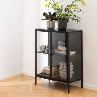 De Bori vitrinekast van House Collection is gemaakt van zwart, mat staal en heeft daardoor een stoere uitstraling. De lage metalen vitrinekast is voorzien van 3 legplanken en heeft 2 glazen deuren. Ook de zijwanden zijn gemaakt van glas, waardoor deze kast een ruimtelijke uitstraling heeft gekregen. Perfect dus om glazen, servies of memorabilia in uit te stallen.