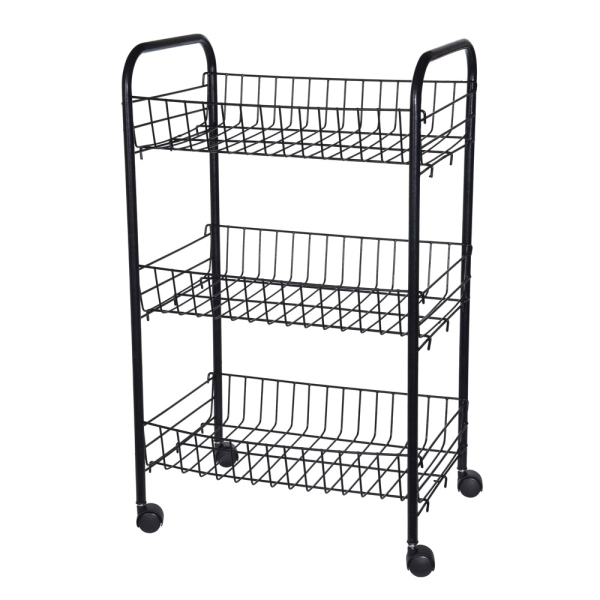 De praktische Aiden keukentrolley van MyHome is jouw hulpje in de keuken! Het zwart rek op wielen is gemaakt van staal en heeft 3 niveaus. In de 3 ruime mandjes kan je allerlei keukenspullen kwijt, van voedingsmiddelen tot keukentools. Ook in de wasplaats kan de trolley goed van pas komen voor het opbergen van wasknijpers, wasmiddel of andere benodigdheden. Het rolrekje is 40 cm lang, 26 cm breed en 62 cm hoog.