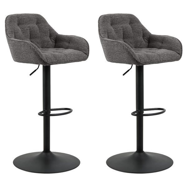De Dione barkrukken van Smuk zijn een stijlvolle toevoeging voor in jouw interieur. De grijze barkruk heeft een zachte bouclé bekleding gemaakt van polyurethaan en staan op metalen poot. De grijze bekleding heeft een getuft design wat voor een luxueuze uitstraling zorgt. De metalen poot is verstelbaar in de hoogte en heeft een draaifunctie. Voor extra comfort is de barkruk ook voorzien van een voetensteun. De barkruk heeft een breedte van 52 cm, een diepte van 52 cm, een hoogte van 109 cm, en een zithoogte van 63 cm tot 84 cm. De bouclé barkruk Dione wordt als set van 2 barkrukken verkocht.