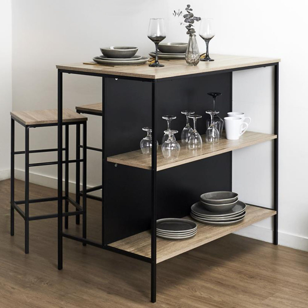 Zorg voor een leuke ontbijthoek of barhoek met de Connor eetkamerset van Uniquely. De Connor set is een 3-delige eethoek bestaande uit een keukeneiland en 2 bijpassende krukken. Aan de ene kant van het keukeneiland kan je zitten, en aan de andere kant van het keukeneiland heb je een opbergrek. Je kan het opbergrek gebruiken om servies, potten en andere kookaccessoires op te bergen, of je kan het gebruiken als plantenrek. De set voor 2 personen is gemaakt van MDF en metaal, en heeft een kleurcombinatie van zwart en hout.