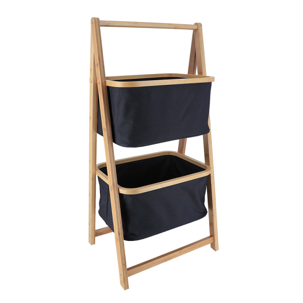 Het Ella mandenrek van Lamento is een handige organizer voor in de badkamer. Het mandenrek heeft namelijk 2 niveaus, met 2 zwarte manden. Het mandenrek is gemaakt van bamboe, een houtsoort die perfect geschikt is voor vochtige ruimtes. De manden zijn gemaakt van polyester. Gebruik het Ella opbergrek om enkele badkameraccessoires en handdoeken op te bergen, en zo je badkamer netjes op orde te houden. Het Lamento mandenrek heeft een breedte van 44 cm, een diepte van 34 cm en een hoogte van 90 cm.