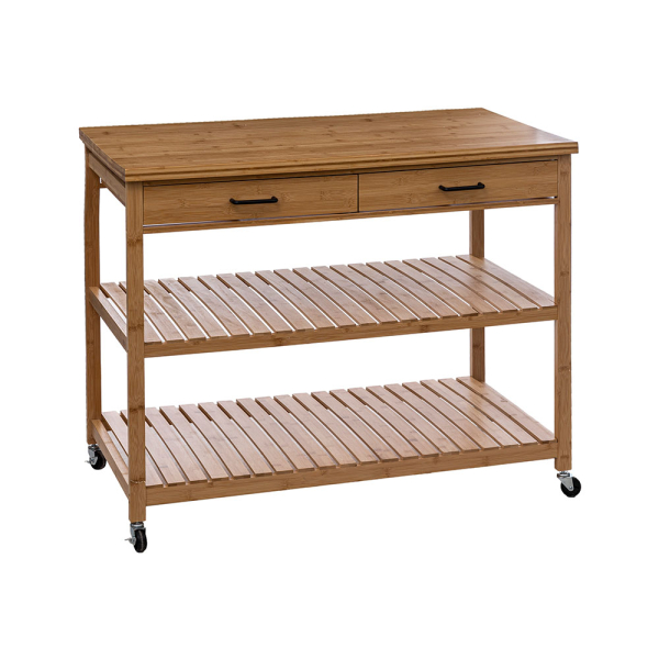 De praktische Louna trolley van Eazy Living is een opbergmeubel met werkplank, planken en lades voor in de keuken. De bruine trolley is volledig gemaakt van bamboe, en heeft een strak ontwerp. Het opbergrek op wielen is voorzien van 2 planken en 2 lades. De trolley past goed in een Scandinavisch interieur. De rolwagen is dankzij het werkblad ideaal om tijdens het koken in de keuken te gebruiken. In de lades kan je bestek of onderleggers kwijt en op de planken fruit, groenten, borden, glazen of kommen. De kast is 108cm breed, 60 cm diep en 90 cm hoog.