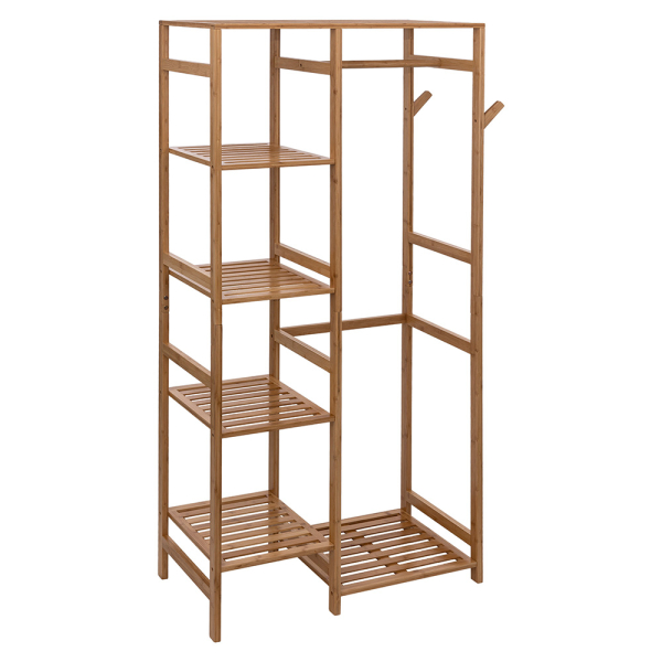 Met het Eloisa kledingrek van Eazy Living zorg je voor voldoende opbergruimte voor je kleding, jassen en accessoires. Het bamboe kledingrek heeft verschillende opbergmogelijkheden. Zo is het opbergrek voorzien van een kledingroede, 4 legplanken en 2 kapstokhaken. Je kan de Eloisa in de hal, slaapkamer of dressing plaatsen. Het opbergrek heeft een breedte van 87 cm, een diepte van 43 cm en een hoogte van 170 cm.