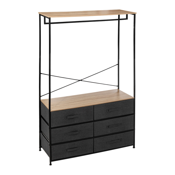 Met de Verdun kledingrek van Eazy Living zijn je kleding en accessoires altijd netjes opgeruimd. Het kledingrek heeft een compact formaat en is voorzien van een kledingroede en 6 stoffen opbergmanden. Het kledingrek van Eazy Living kan je gebruiken in de hal om jassen, sjaals, schoenen en meer op te bergen. Je kan het kledingrek ook in de dressing of slaapkamer gebruiken om kleding en accessoires op te bergen. Het Verdun opbergrek heeft een stalen frame met houten planken van spaanplaat.