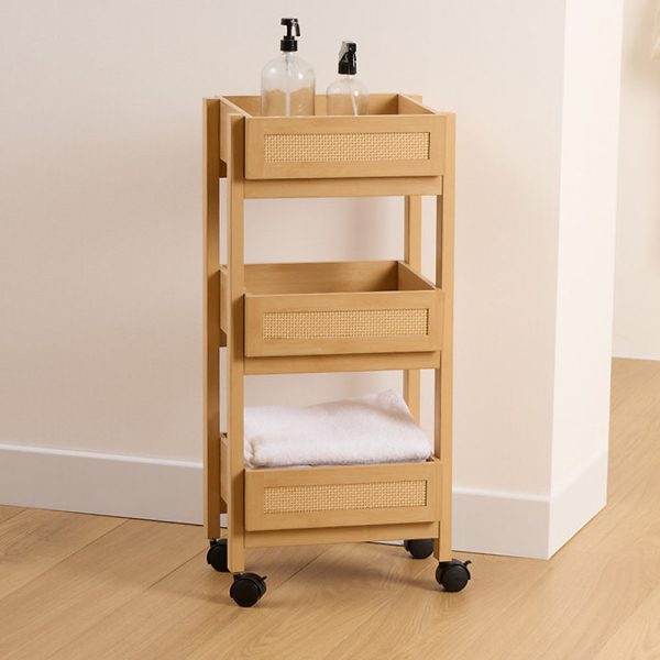 De Sylvain opberg trolley op wielen is de ideale oplossing om extra opbergruimte te creëren op een stijlvolle manier. Dankzij het smalle ontwerp en de verrijdbare functie is deze Eazy Living trolley perfect voor gebruik in de keuken, badkamer, kantoor of hobbyruimte. De houtlook zorgt ervoor dat hij zonder moeite in verschillende interieurstijlen past.
