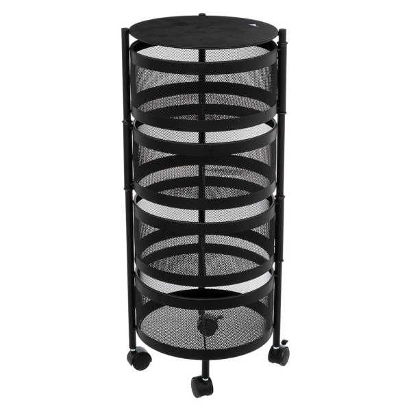 De Deanne ronde trolley van Eazy Living is een handig accessoire voor in je keuken, badkamer of woonkamer. De zwarte trolley is volledig gemaakt van ijzer, en heeft een strak ontwerp. De Deanne is voorzien van 4 mandjes en 4 wielen. De opberger op wielen kan je in je keuken als keukentrolley gebruiken voor kookboeken, keukenaccessoires, kruiden, groente en fruit een plaatsje te geven. Je kan de rolwagen ook gebruiken als badkamertrolley voor verzorgingsproducten, haaraccessoires, handdoeken en meer op te bergen. In de woonkamer kan je de trolley ook gebruiken voor knutselgerief, boeken, onderleggers en andere spullen op te bergen.