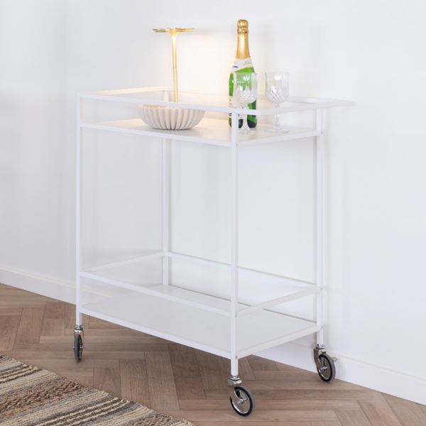 De Dina witte trolley van House Collection is een stijlvol meubelstuk voor in jouw interieur! De House Collection trolley heeft een stalen frame en planken gemaakt van spaanplaat met melaminefolie. De rolwagen is uitgerust met 2 planken en 4 wielen. De trolley kan je gebruiken als decoratie met planten, vazen en andere accessoires, of je kan het karretje gebruiken voor glazen, drinken en hapjes te verplaatsen van de ene kamer naar de andere. De witte Dina heeft een breedte van 68 cm, een diepte van 40 cm en een hoogte van 79 cm.