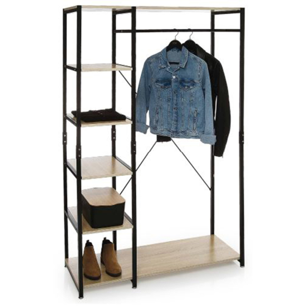 Met dit grote kledingrek Juste van Eazy Living creëer je snel een ordelijke dressing. Hang kleding op aan de kledingroede of plaats schoenen, accessoires of manden op een van de 6 legplanken. Zelfs bovenop het rek is extra opbergplaats voorzien. Het Juste kledingrek heeft een stevig zwart metalen frame en houten planken van spaanplaat.