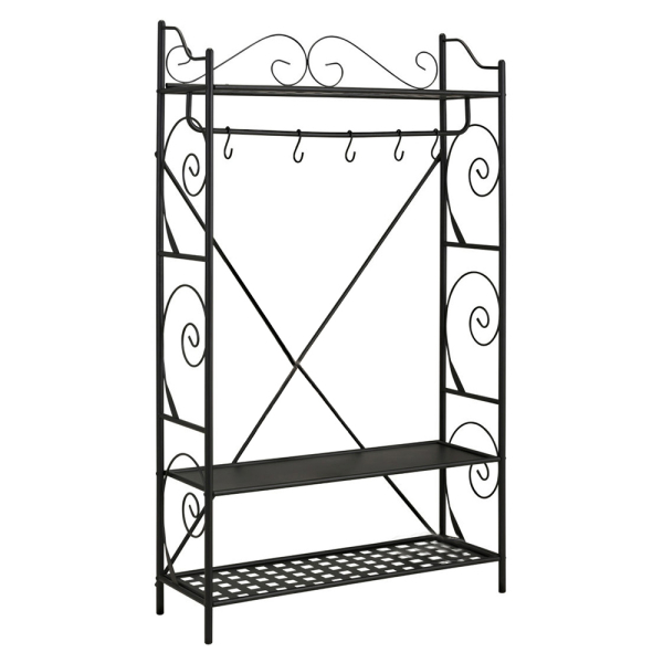 Combineer functionaliteit met een romantisch ontwerp en je hebt het Emelie kledingrek van Lieko. Het zwarte kledingrek is gemaakt van metaal en het verfijnde metalen frame heeft een klassiek design met sierlijke krullen. De dressing heeft 5 kapstokhaken en 3 planken waarop je schoenen, hoeden, tassen en andere accessoires kan opbergen. Het zwartgelakt kledingrek kan je in je hal plaatsen als halmeubel maar je kan het ook in je slaapkamer of dressing plaatsen. Het kledingrek heeft een lengte van 100 cm, een breedte van 40 cm en een hoogte van 170 cm.