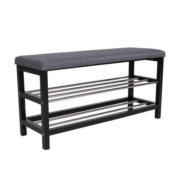 Het Viggo schoenenrek is een praktisch 2-in-1 meubelstuk. De opbrger heeft 2 schappen voor het opbergen van schoenen en een zachte zitbank. Het zitkussen is gemaakt van grijs polyester en biedt je al het nodige comfort tijdens het aan- en uittrekken van jouw schoenen. Het stijvol Viggo rek is een handig opbergmeubel voor in de inkomhal, de wasplaats, de slaapkamer of in de dressing. Het rek is 1 meter lang, 34 cm breed en 50 cm hoog.