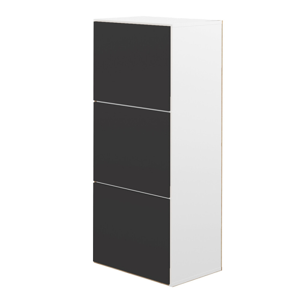 De wit met zwarte schoenenkast Amalia van Interia is een moderne opberger die in elk interieur past. De schoenenkast bestaat uit 3 deuren met 5 legplanken. De opberger is gemaakt van spaanplaat met een melamine-afwerking. Met het Amalia kastje heb je een grote opbergcapaciteit in een compact formaat.